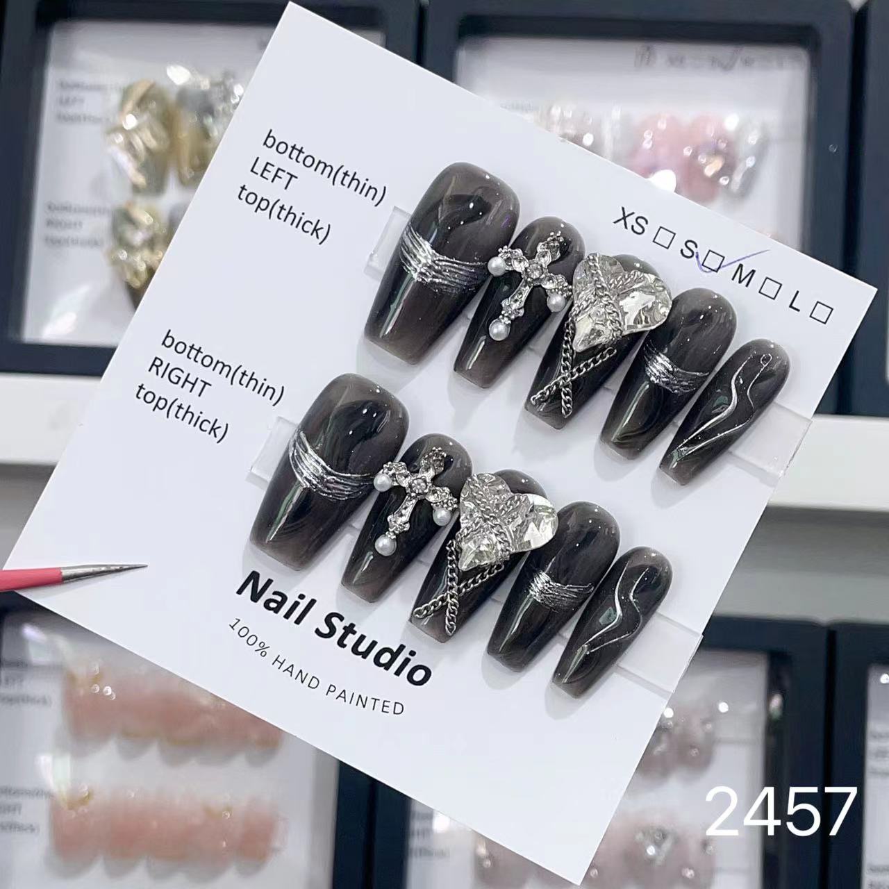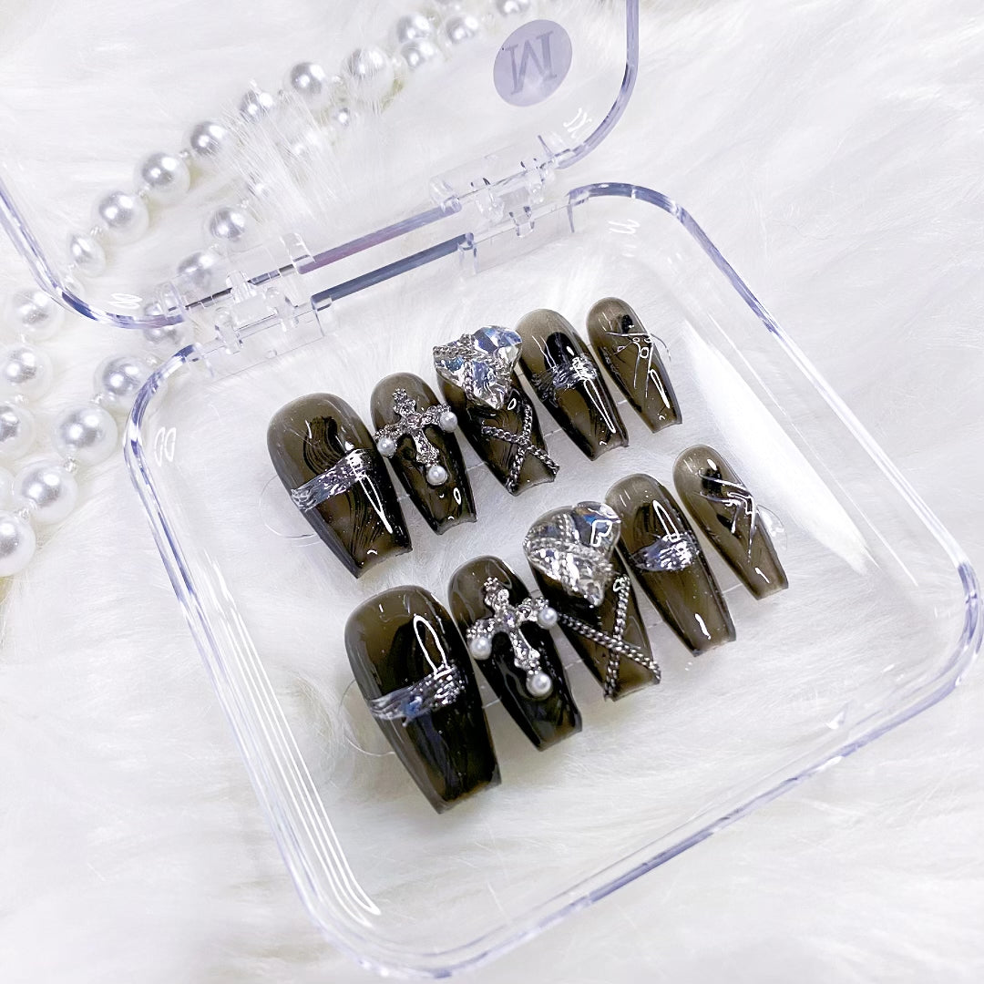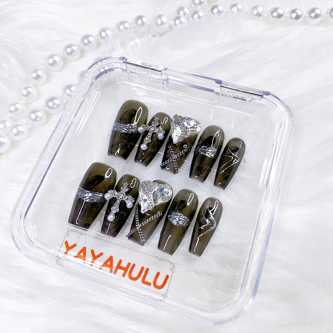 Elevate your style with our black love diamond press on nails. These nails are perfect for adding a touch of elegance and glamour to any look. With easy, mess-free application, you can achieve a flawless manicure in minutes. Elevate your confidence and make a statement with our black love diamond press on nails.